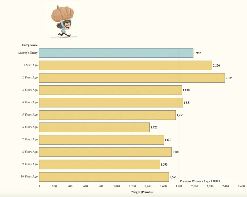 I wanted to make those complex problems feel simple and relatable. The idea of entering a pumpkin contest and using data visualizations to overcome the hurdles of choosing the best part of the yard, selecting the right seed types, ultimately choosing the right pumpkin, and then comparing your results to previous winners felt very real and tangible.